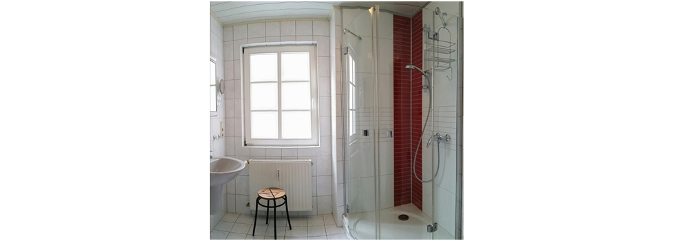 Das Bad ist mit Dusche und WC ausgestattet.